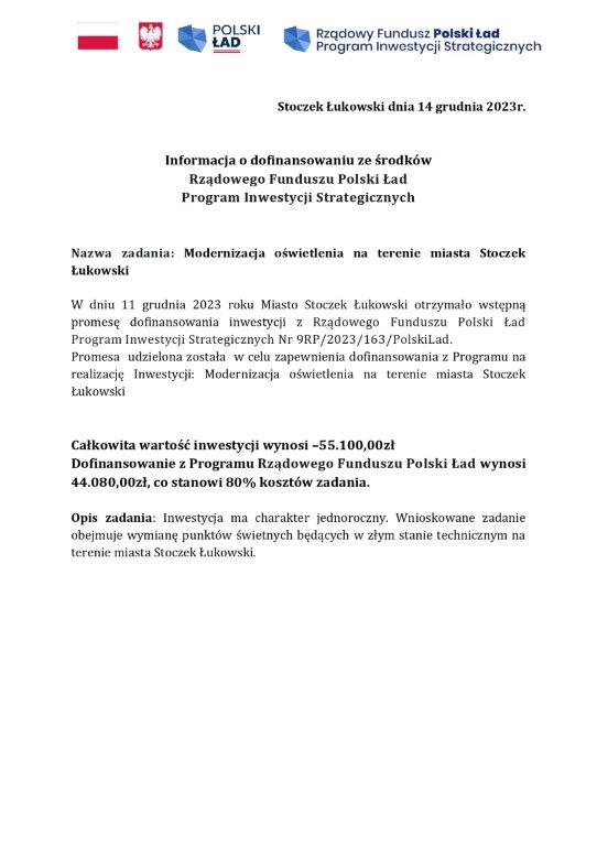 Informacja o dofinansowaniu ze środków Rządowego Funduszu POLSKI ŁAD PROGRAM INWESTYCJI STRATEGICZNYCH – „Budowa żłobka wraz z infrastrukturą towarzyszącą w m. Stoczek Łukowski”
